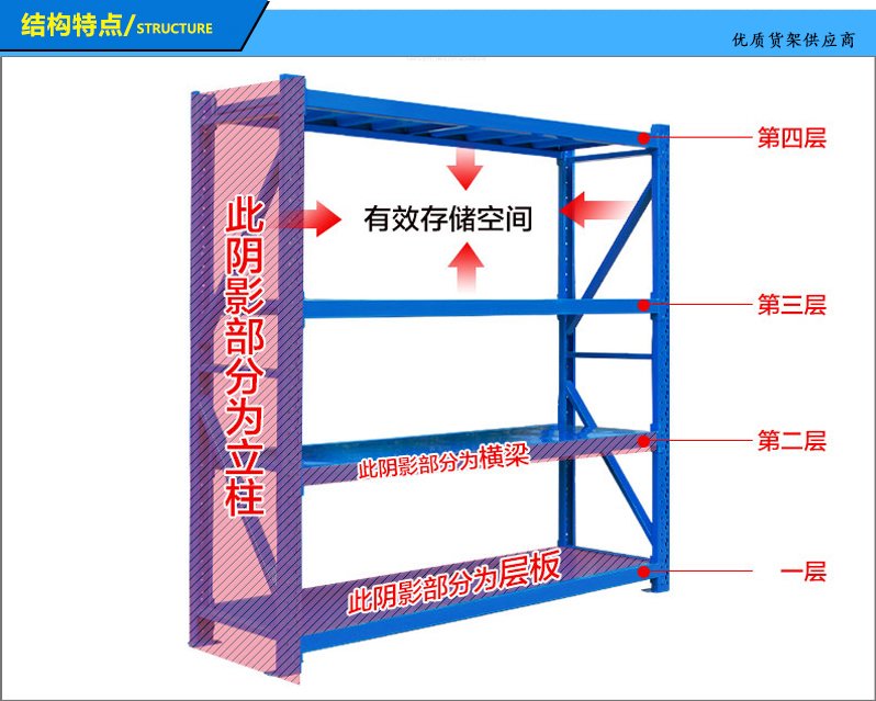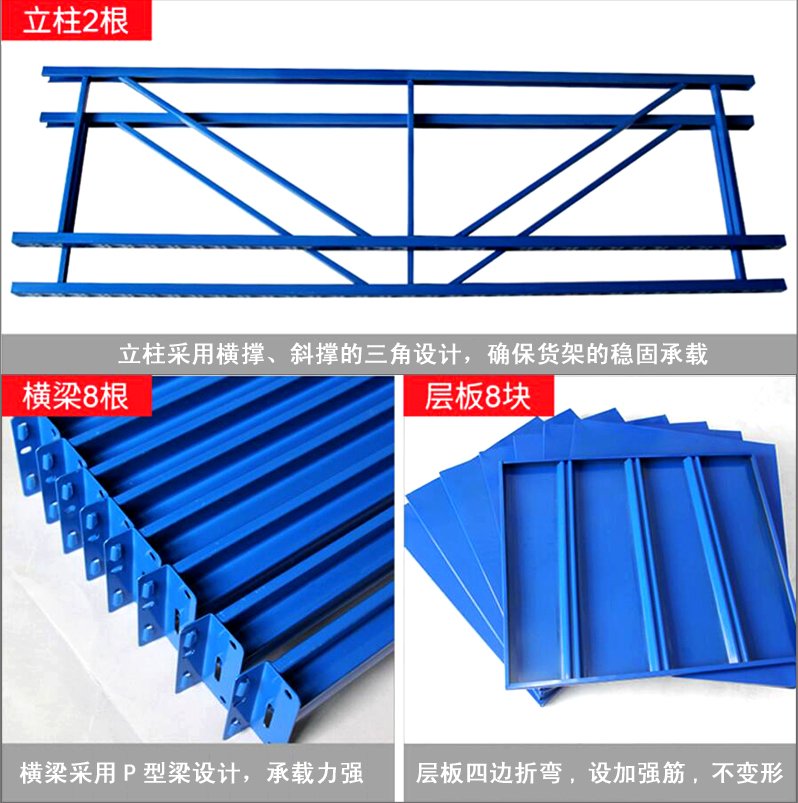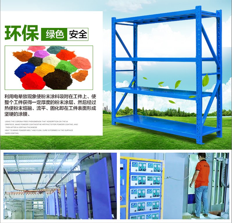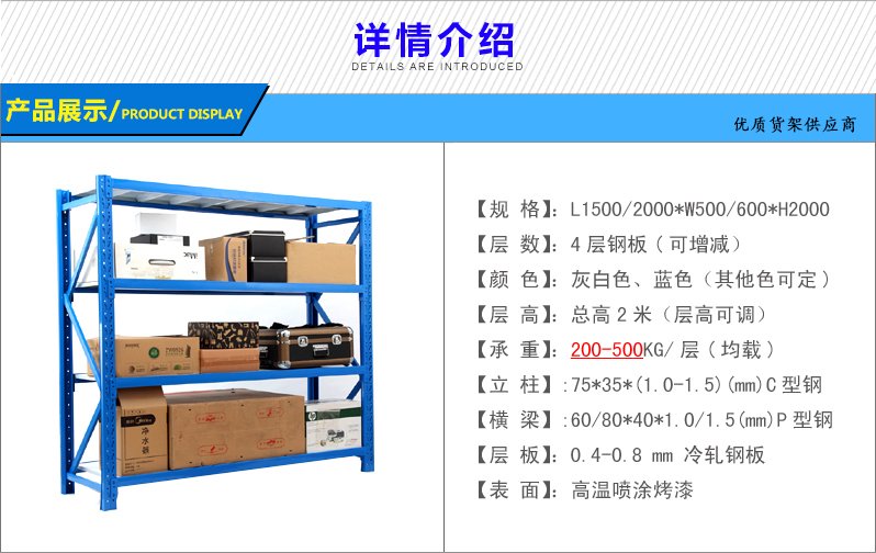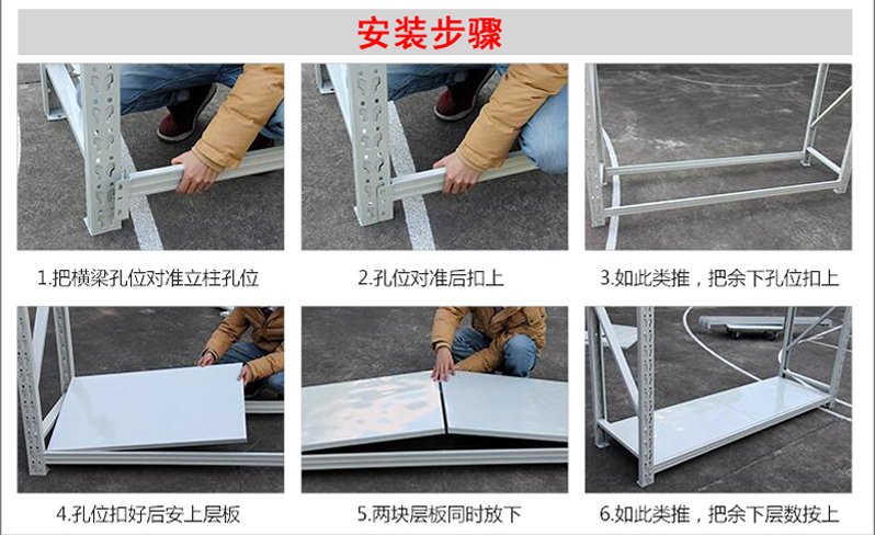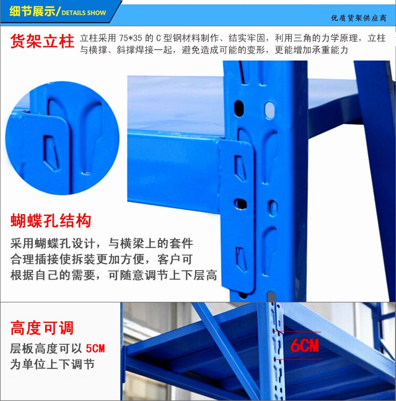 3、層板有木板和鋼板可供選擇,立柱高度設有每50mm調節(jié)孔距,可根據(jù)貨物高低調節(jié)層間使用。