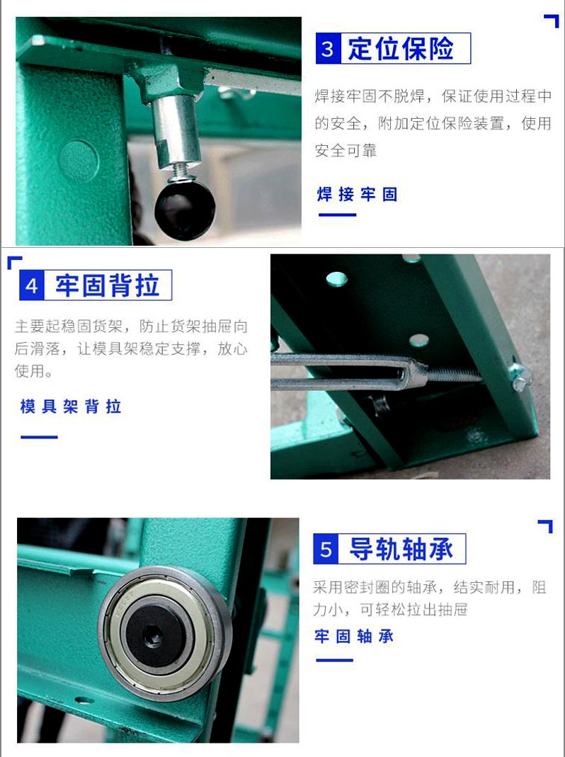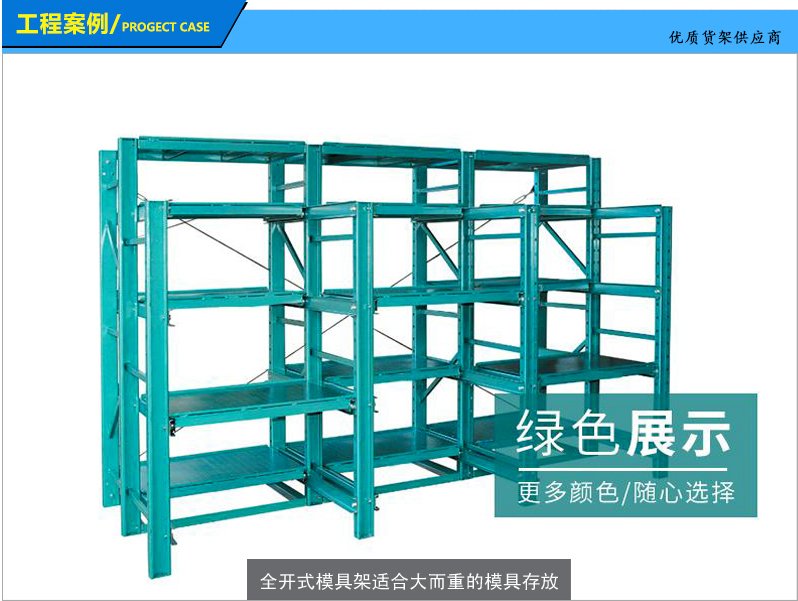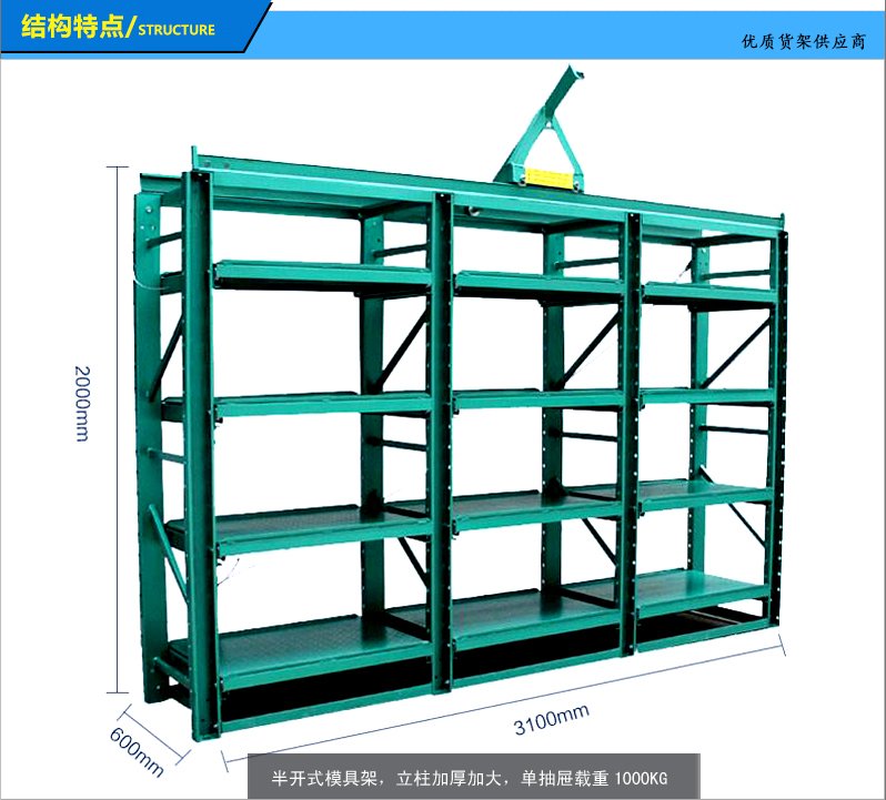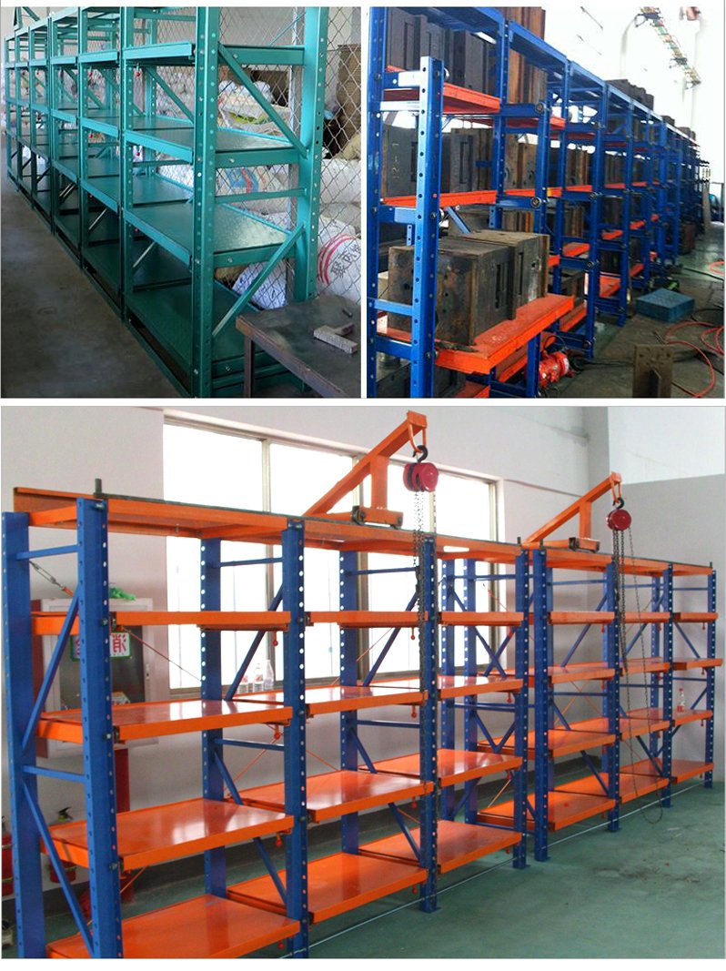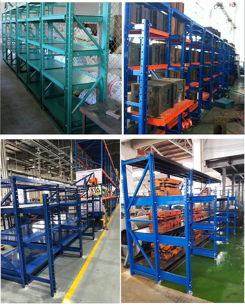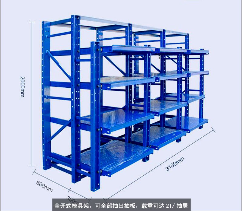 模具貨架適合于存放模具等機械加工塊的存放。占地少、承重大、分類詳細、存取方便。抽屜式滑道,可以80%抽出,操作簡易,安全,是現代化工廠的維修及加工車間的工位器具。