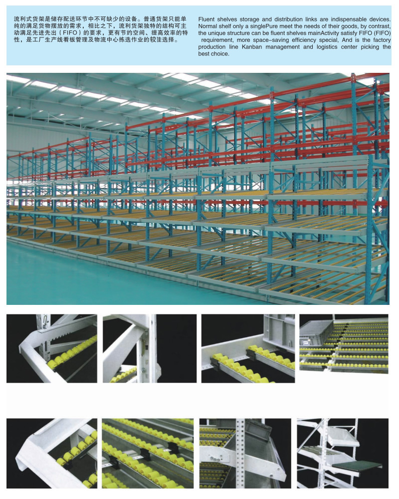 流利式貨架廣泛應用于制造業(yè),商業(yè),配送中心,裝配車間以及出貨頻率較高的倉庫流利式貨架:采用輥輪鋁合金,鈑金等流利條,利用臺架自重實現(xiàn)先進先出,存儲方便,適用于裝配線兩側配送中心等場所。